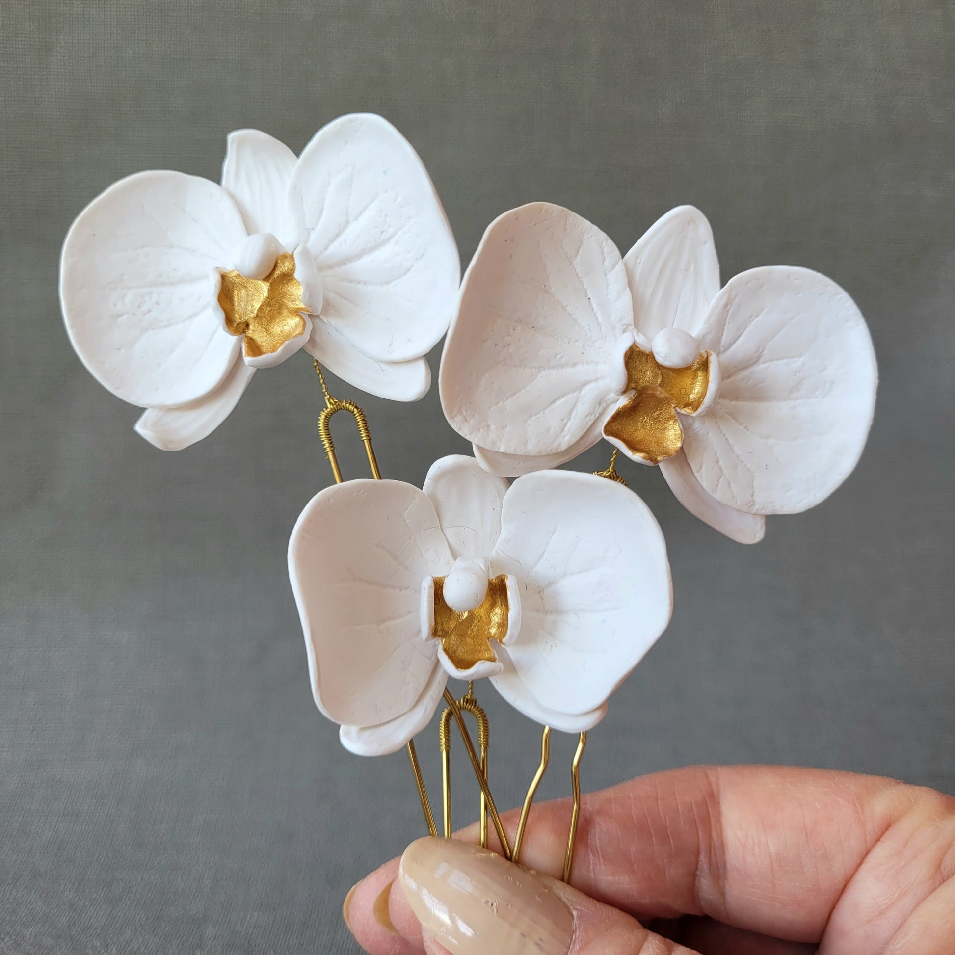 Ivory orchids float above 3 x 6-7cm pins, with gold or silver painted centres. This set includes one pin with a just opened bloom, and two pins with fully opened flowers. The open flowers are approx. 5.5cm x 3.5cm each.